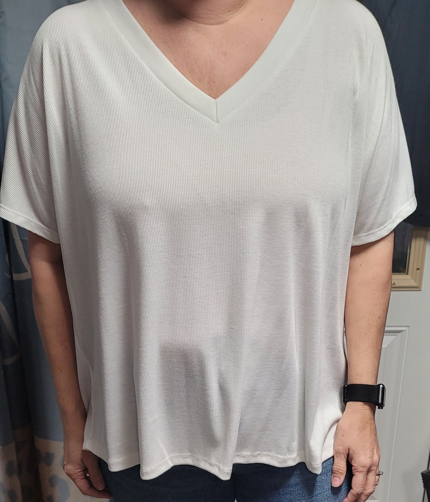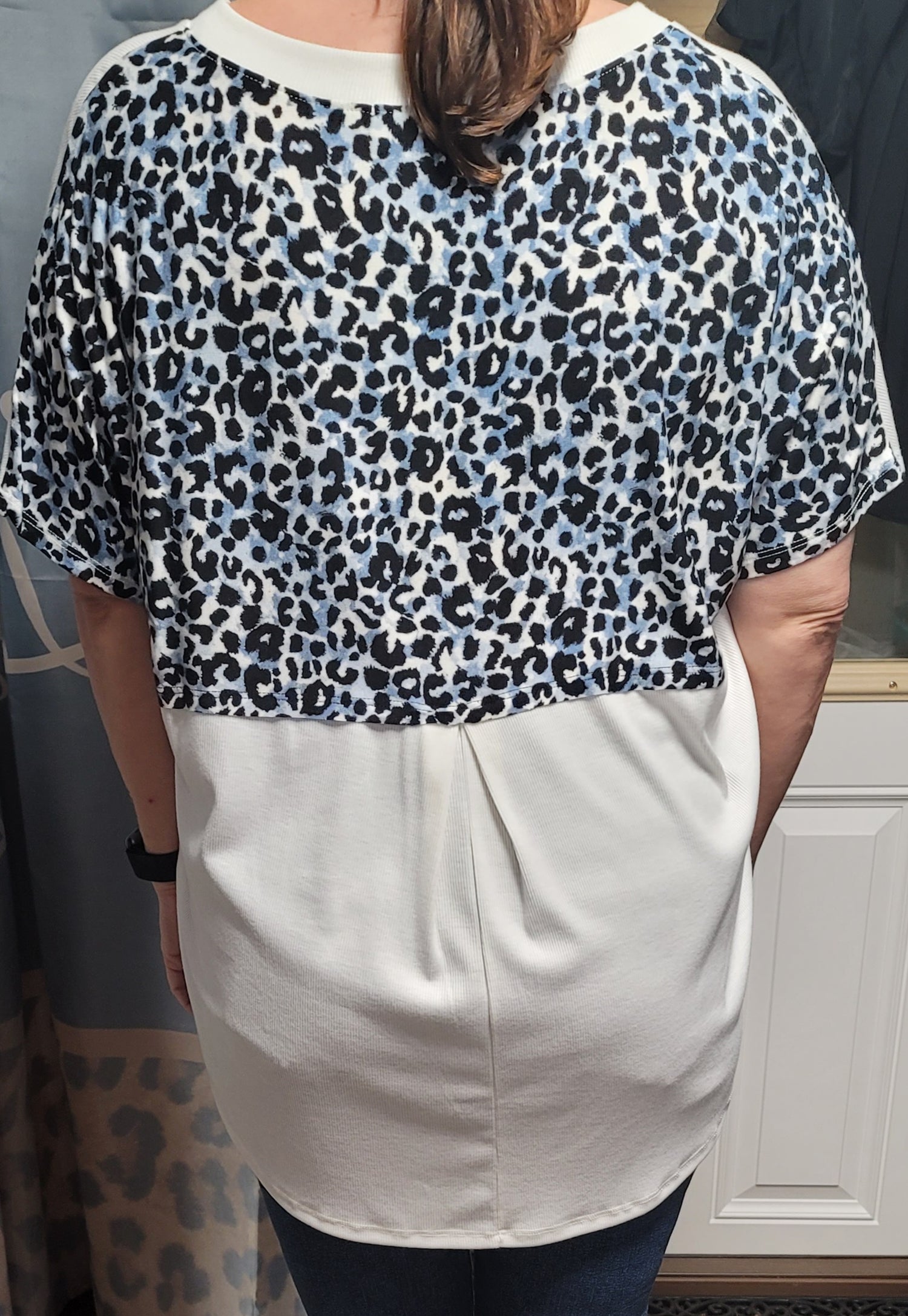 This is a V neck short sleeve loose fit top with color block Leopard back.